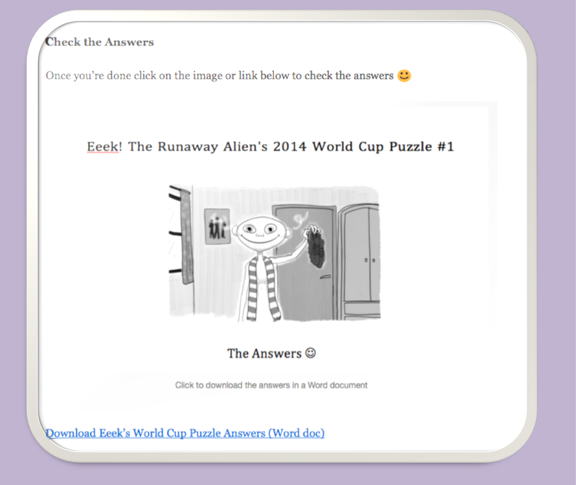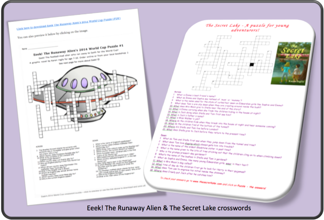 For Eeek! The Runaway Alien – in which a football-mad alien runs away from space to Earth for the World Cup – I used a crossword to pick up on the buzz of the 2014 World Cup. Thus most of the clues focused on simple general knowledge to do with the World Cup teams, matches and players. For the background images I chose an alien spaceship from the puzzle maker site’s library of images rather than one of my own graphic novel images. I then tweeted links to the crossword (which can be downloaded in Word or as a PDF from my website) using #WorldCup2014 and other relevant hashtags being used for specific matches – targeting mainly soccer-loving dads! Because #WordCup2014 was trending at the time, this led to over 50 downloads over a short period. (This may not sound like much but in children’s publishing terms it really isn’t that bad – and all helps to spread the word about the book!) During that period I also I provided handouts of the crossword with books to my local bookshop, which stocks all of my books.