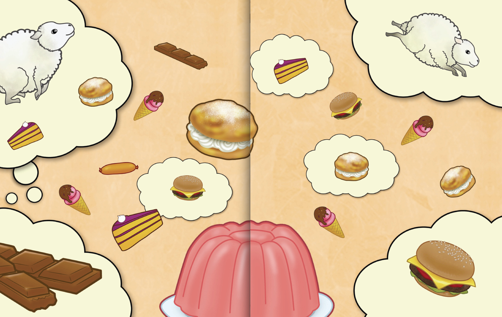 I borrowed a lot of picture books from the local library and rummaged around in the loft for old favourites we’ve kept, such as Hairy Maclary. I was interested to study not just how the publishers had placed and interwoven the text and illustrations, but also to see how they had used their front and back matter pages (title page, half title, about the author etc). What’s acceptable, such as inclusion of illustrations with copyright info, and the sequence in which the title page appears seems to be pretty flexible! I have a fun double page collage spread at the start of Ferdinand Fox’s Big Sleep – it features a lot of the food we later see Ferdinand dreaming about, offering additional discussion and learning opportunities. I got the idea for this from some of the books I looked at.